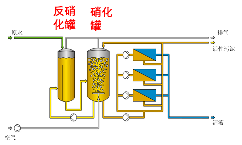 反硝(xiao)(xiao)化/硝(xiao)(xiao)化罐+外置式UF系統(tong) (MBR)工藝原理圖
